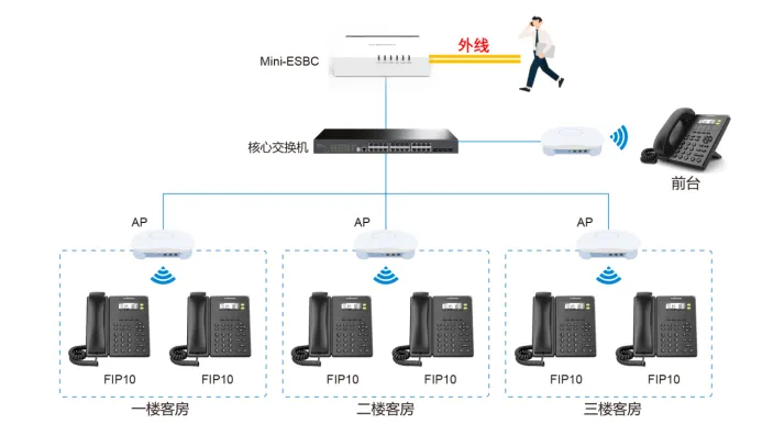 2、在客房和前台区域通过无线部署IP电话系统,所有FIP10话机通过WiFi连接到无线网络,注册到Mini-ESBC设备上,所有话机自动获取分级账号,无需手动配置。