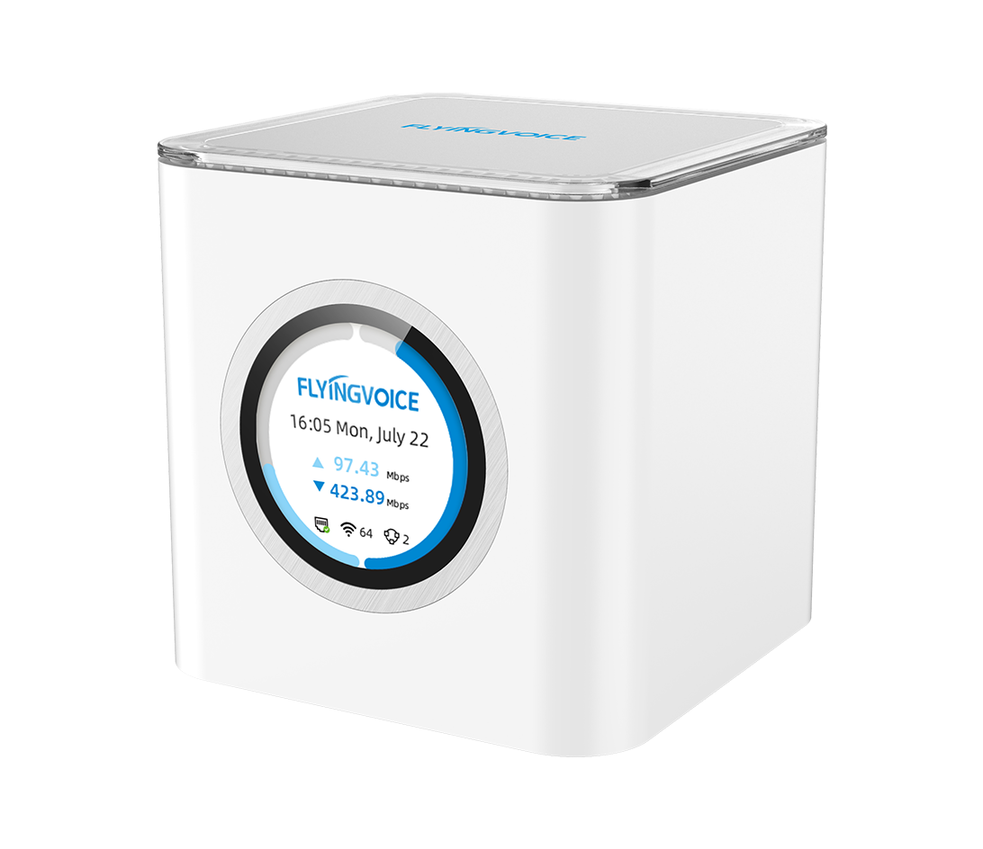 飞音 SR3000 采用简约的高颜值设计,外观小巧精致,搭配 1.7 英寸的圆形触控彩屏,直观显示时间、上/下行实时网速、设备联网状态、无线终端数量、Mesh 节点等信息,且支持触屏配置,高效实现 Mesh 组网。