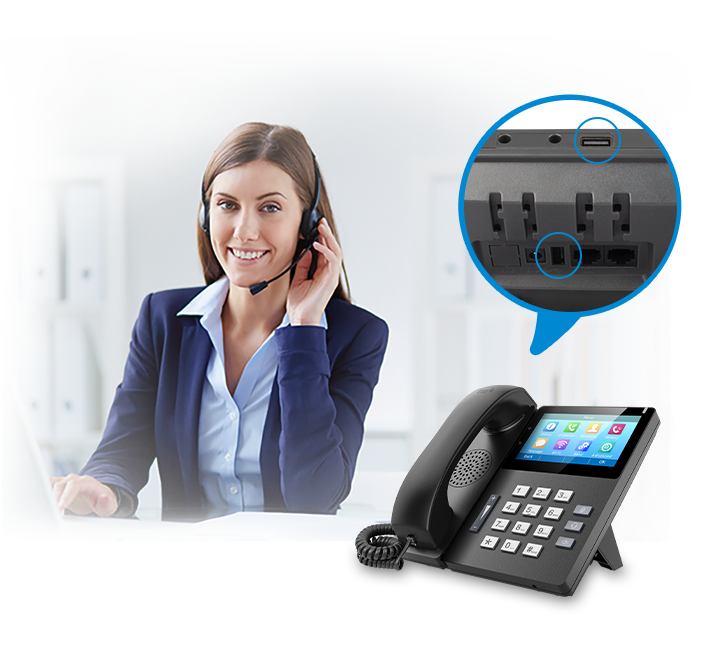 自带双USB 2.0接口,支持USB耳麦、DECT耳麦与U盘录音功能,根据需求搭配使用,满足更多应用场景。